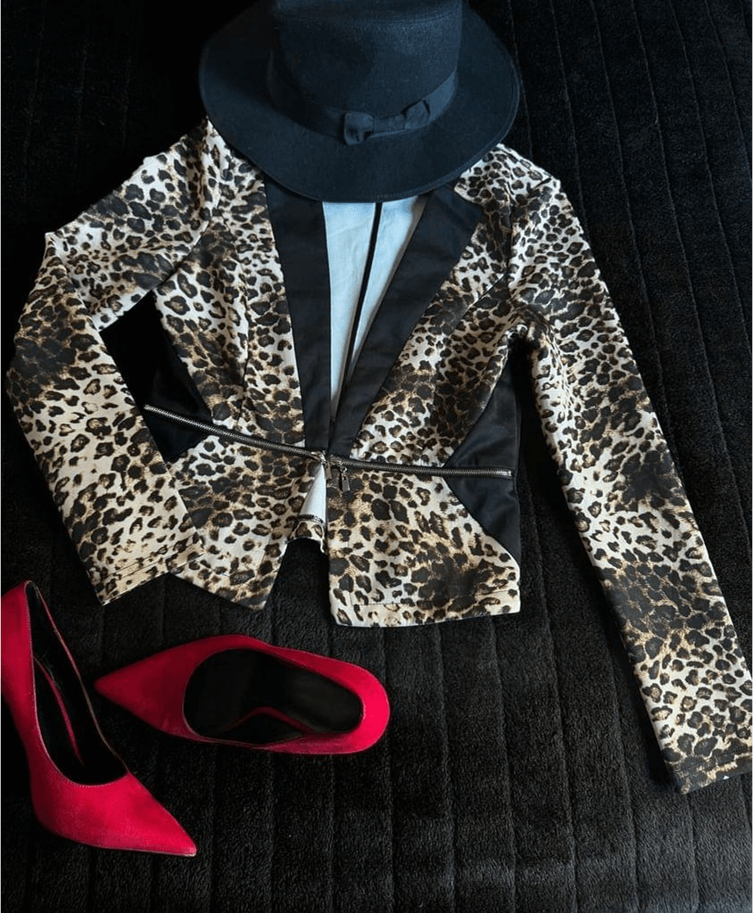Ovaj moćni model s leopard uzorkom odiše samopouzdanjem, strašću i slobodom. Crne kontrastne linije naglašavaju figuru i stvaraju besprijekorno oblikovanu siluetu. Metalni detalj na struku dodatno ističe vašu snagu i senzualnost.